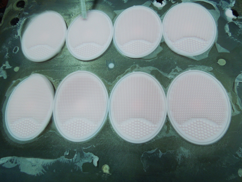 首先產品的注意工作主要在于模具,由于潔面刷模具的結構比較復雜,模具是采用三層模具制作,模芯需要從機臺上取下在用人工拉扯方式將產品從模板上取下,所以在取下的過程當中可能會導致刷頭斷裂在模芯當中,這就會導致產品出現不良,而為發現的情況下又會導致第二次模壓時出來的產品連續不良,所以在生產潔面刷的過程當中,剛生產出來的產品對于檢貨是非常重要的,如當時未發現問