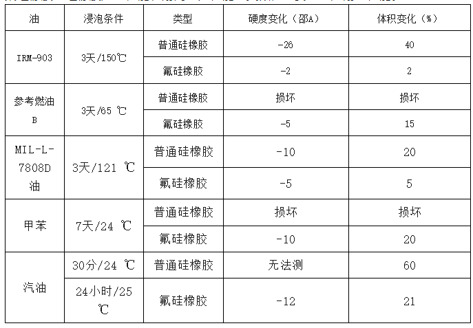 氟硅橡膠與普通硅橡膠比較,氟硅橡膠與硅橡膠加工性能、耐高低溫性能均類似,主要差別是耐油性能,上面明顯可見在經(jīng)過不同參數(shù)的對比后,普通硅膠材質(zhì)不論在硬度還是形狀的都有一定的差異。