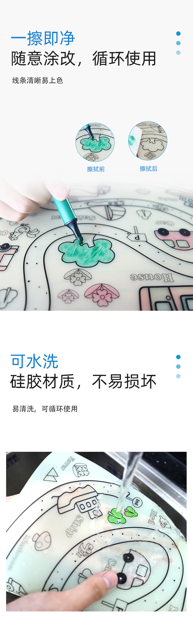 硅膠涂鴉畫板產品的主要買點源于產品的表面圖案以及配套的創意,產品從6-12歲之間具有不同的主題與認知圖案,可以連接整體進行學習提升大腦開發,加強兒童動手能力以及創新創作能力,此外產品配比水性可清洗彩色筆,不會對硅膠表面產生筆污以及筆畫痕跡,材料屬于柔軟回彈食品級硅膠,所以硅膠店鋪可以任意曲折來回折疊不會變形損壞,此外硅膠墊片可水性可隔熱,可耐高低溫,可以在多個行業領域當中運用!